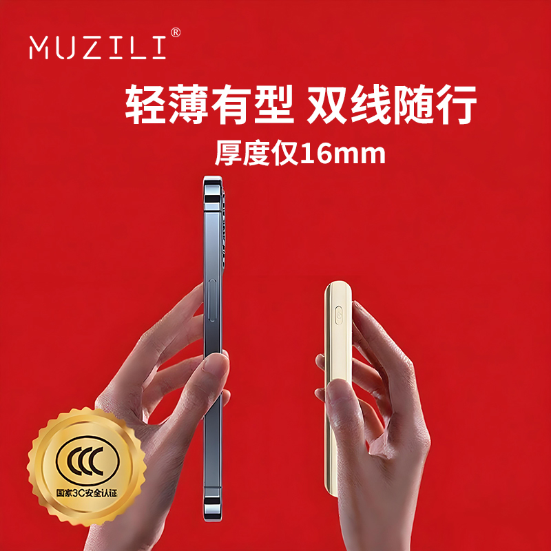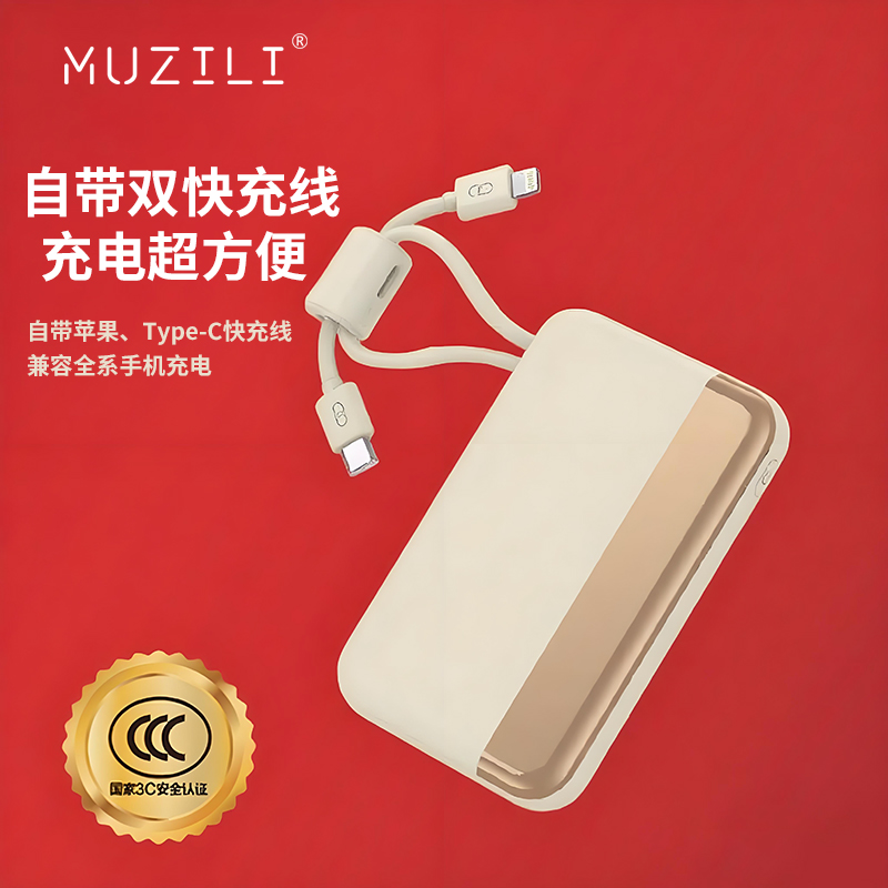 10000毫安实标容量,超薄设计 22.5W超级快充,兼容PD20W 内置苹果/Type-C接口满足各种手机充电 符合民航局标准,可随身携带 颜色:米色(主推) 材质:ABS+电镀 容量:10000毫安 尺寸:69*108*16mm 包装:马年新春彩盒
