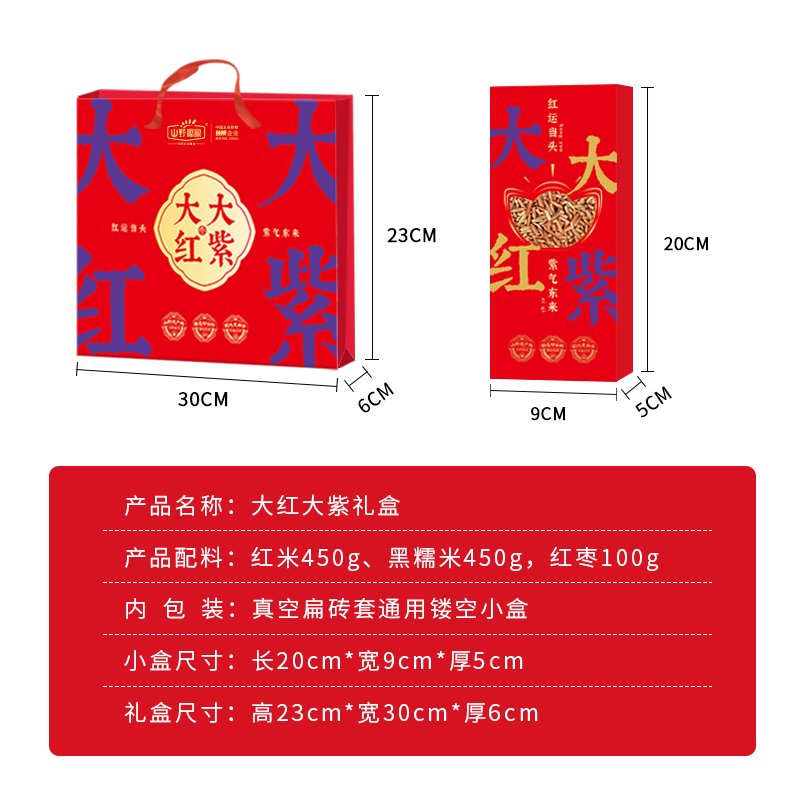 配置:红米、黑糯米各450g,红枣100g 净重:1000g 内包装:真空扁砖套镂空小盒 盒尺寸:23cm*30cm*6cm 箱重量:18.85kg 箱尺寸:50*39*39(0.076方)